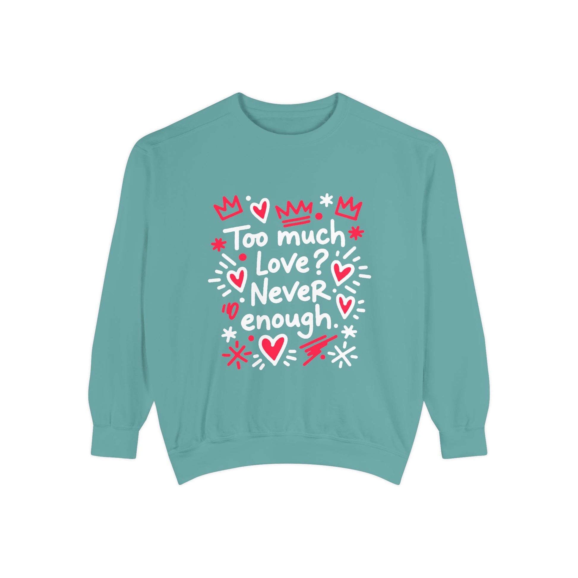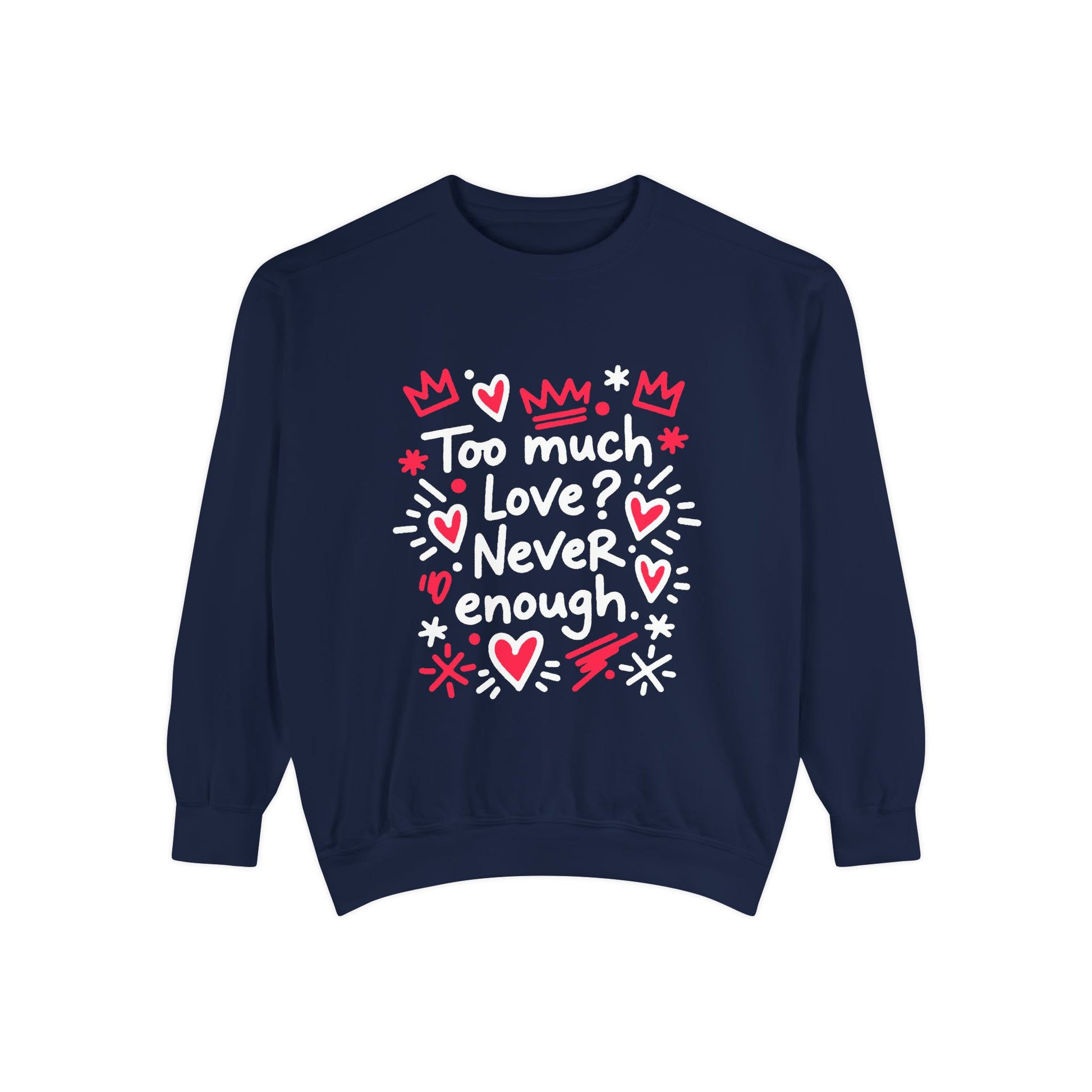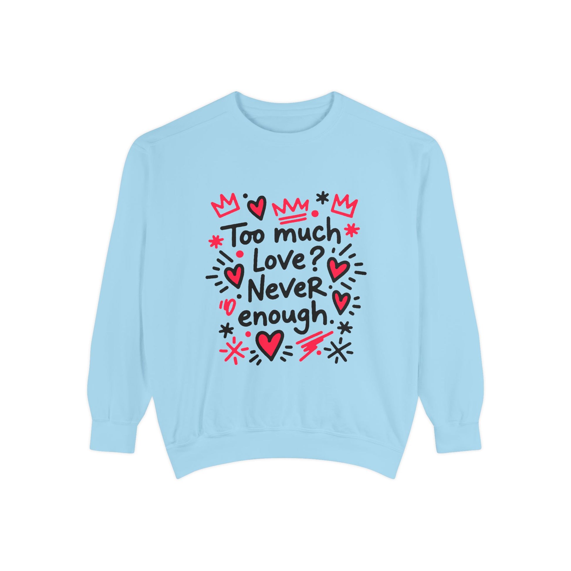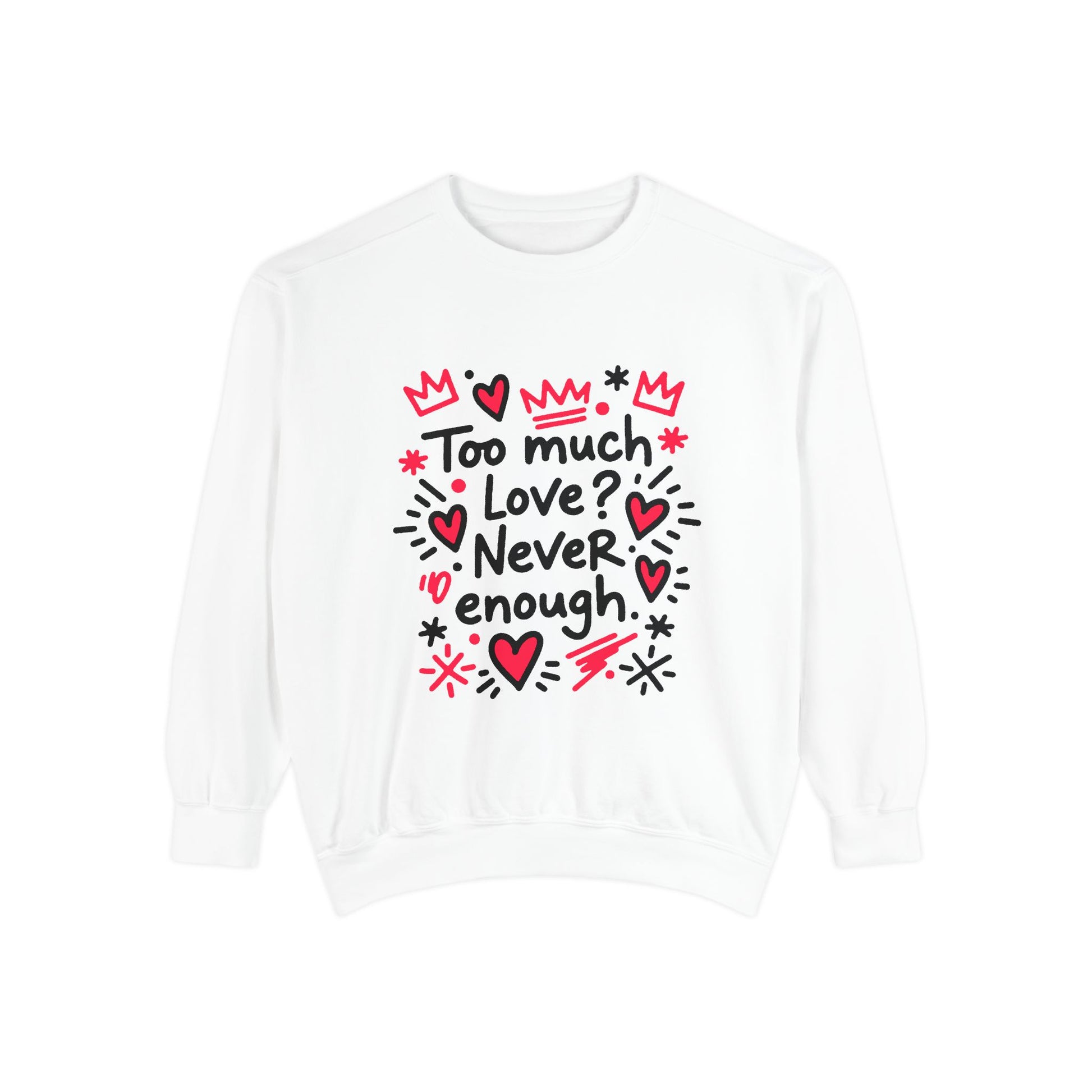 This relaxed-fit, garment-dyed sweatshirt wraps you in a lived-in softness that feels like an old favorite the moment you pull it on. The front illustration—playful hand-drawn hearts, crowns, and the handwritten phrase “Too much love? Never enough”—radiates warm, earnest energy. It’s a cozy layer for slow mornings, late-night walks, or curling up with a sketchbook and a cup of tea. The medium-heavy ring-spun cotton blend holds prints and embroidery beautifully, while the ribbed collar, cuffs, and hem keep the shape after repeated wear. Subtle back neck detail and OEKO-TEX low-impact dyes add thoughtful finishing touches. Wear it when you want to share a little rebellious sweetness without saying a word.