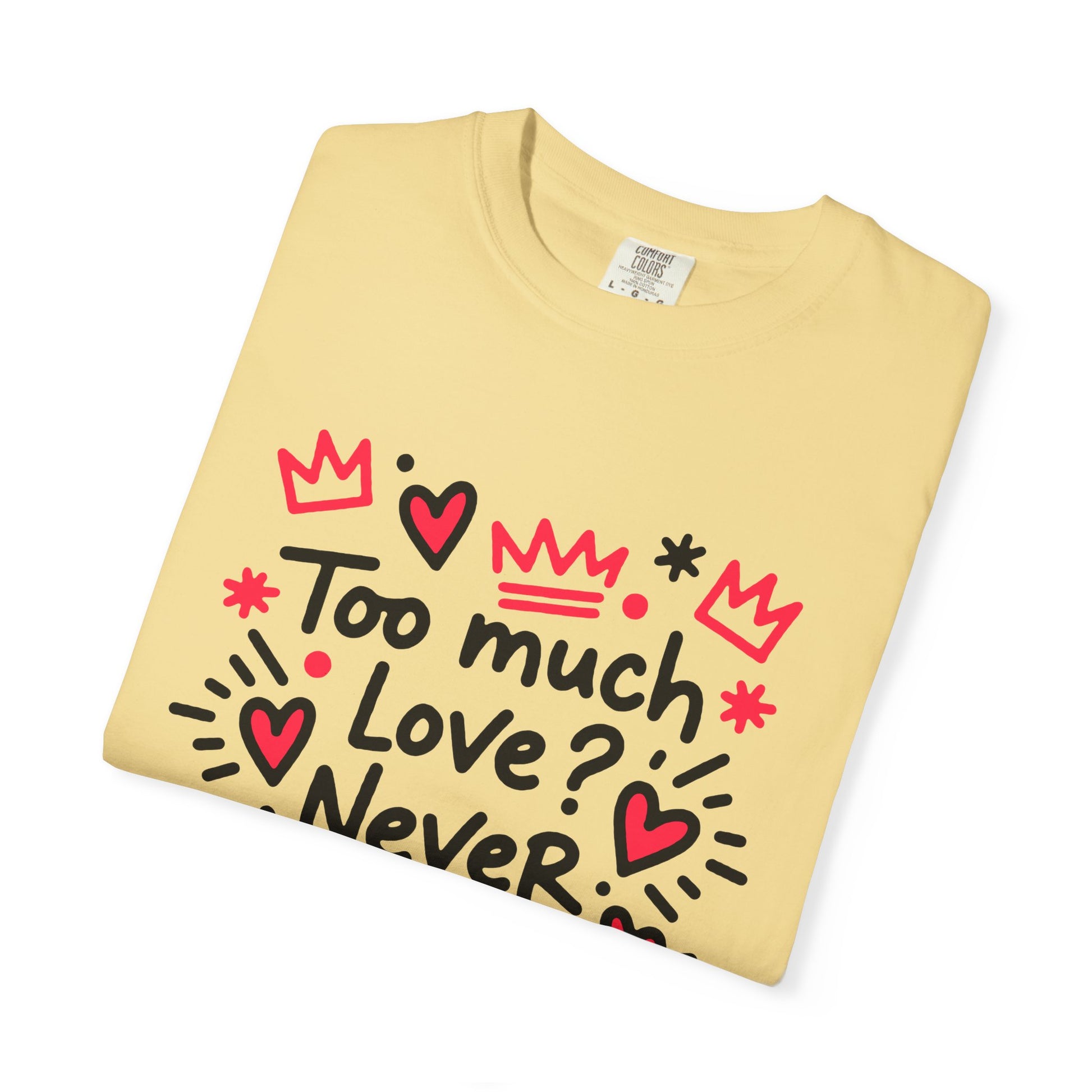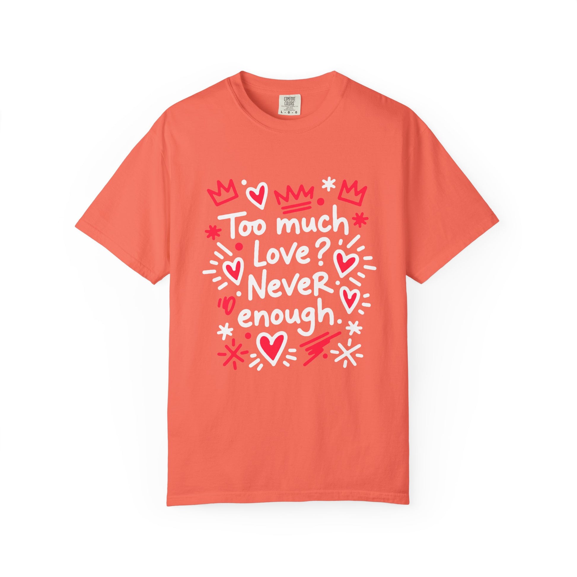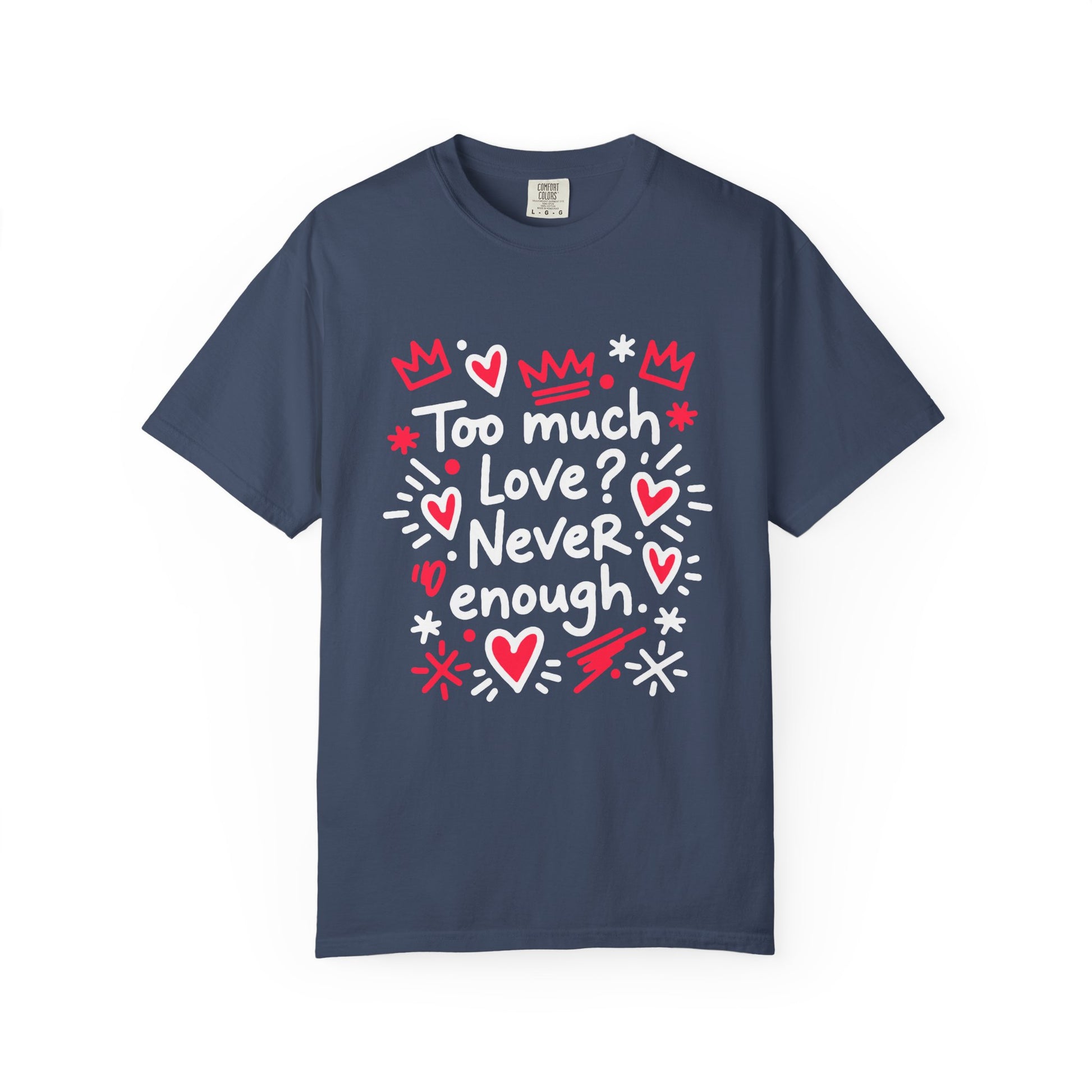 This relaxed-fit, garment-dyed tee carries a hand-drawn, heart-filled message that reads, “Too much love? Never enough.” The soft, lived-in cotton and muted color from post-construction dyeing give the shirt a cozy, vintage vibe. Bold black lettering and playful red accents—crowns, hearts, and sparkles—create an upbeat, slightly rebellious look that feels personal and warm. Wear it alone or layered under a jacket; it reads like a little manifesto for people who wear their emotions on their sleeve and prefer clothing with personality and story.