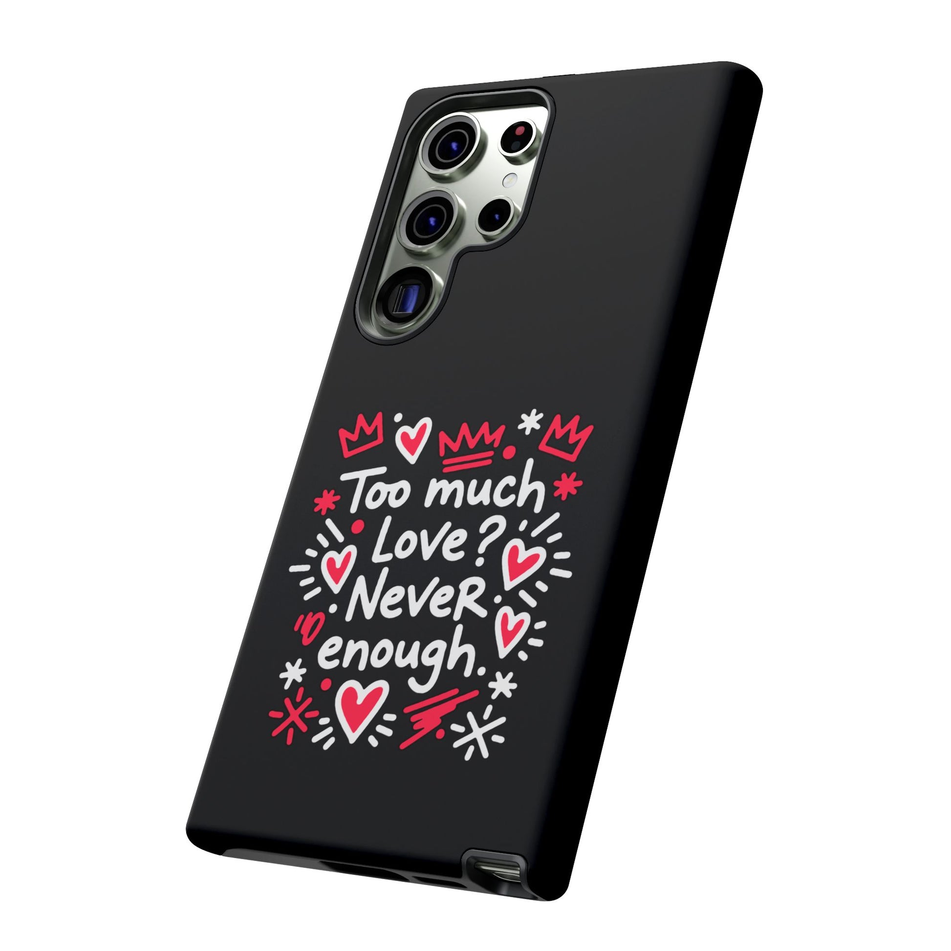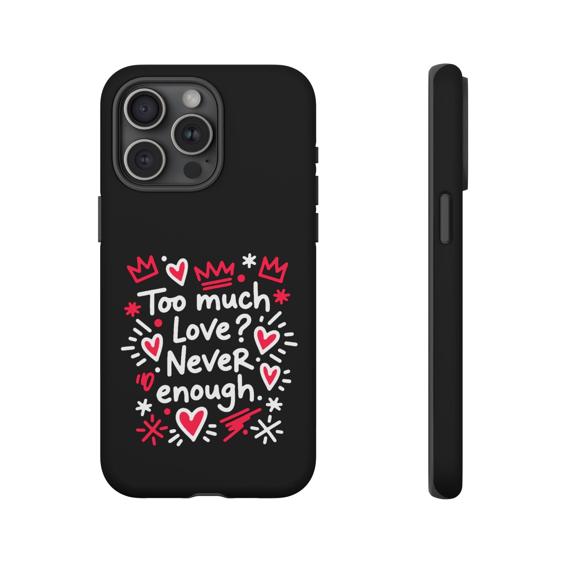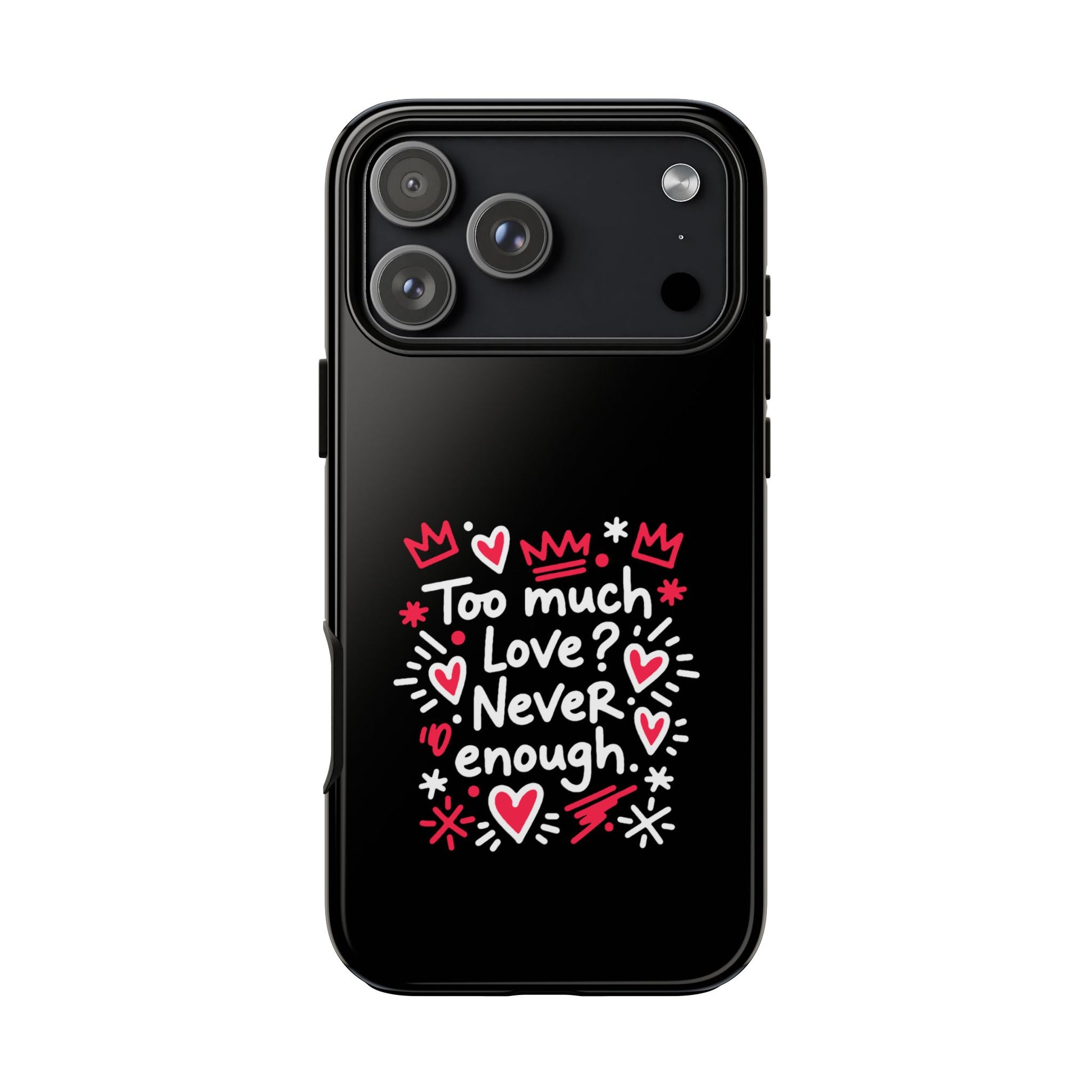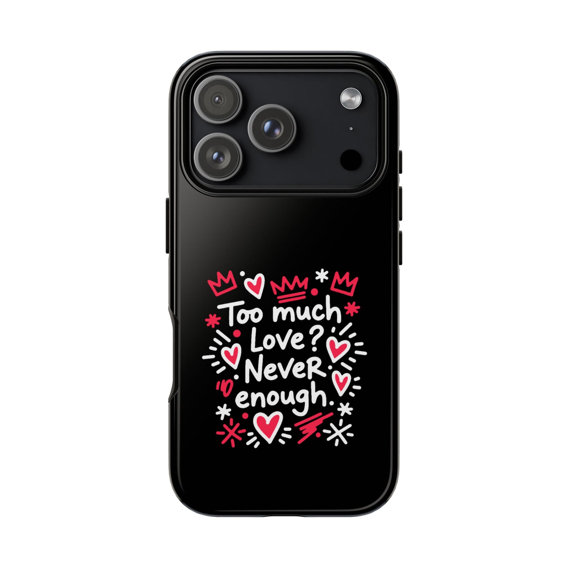 This slim, dual-layer phone case wraps your device in durable protection with a playful, hand-drawn love design. Bold pink hearts, crowns, and energetic doodles surround the handwritten phrase “Too much love?” Never enough,” giving the case an upbeat, personal feel. The glossy or matte finish keeps the artwork vivid, while a TPU silicone liner cushions drops and a polycarbonate shell resists impacts. Lightweight and low-profile, it preserves wireless charging and leaves ports open for easy access. Thoughtful weathering and safety certifications mean this case stands up to everyday life while keeping its charm.