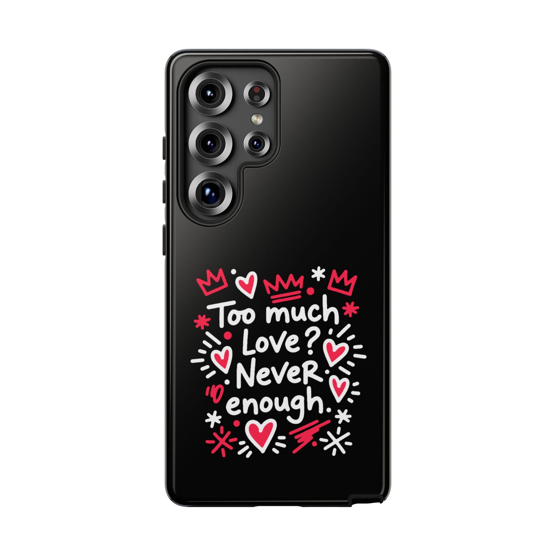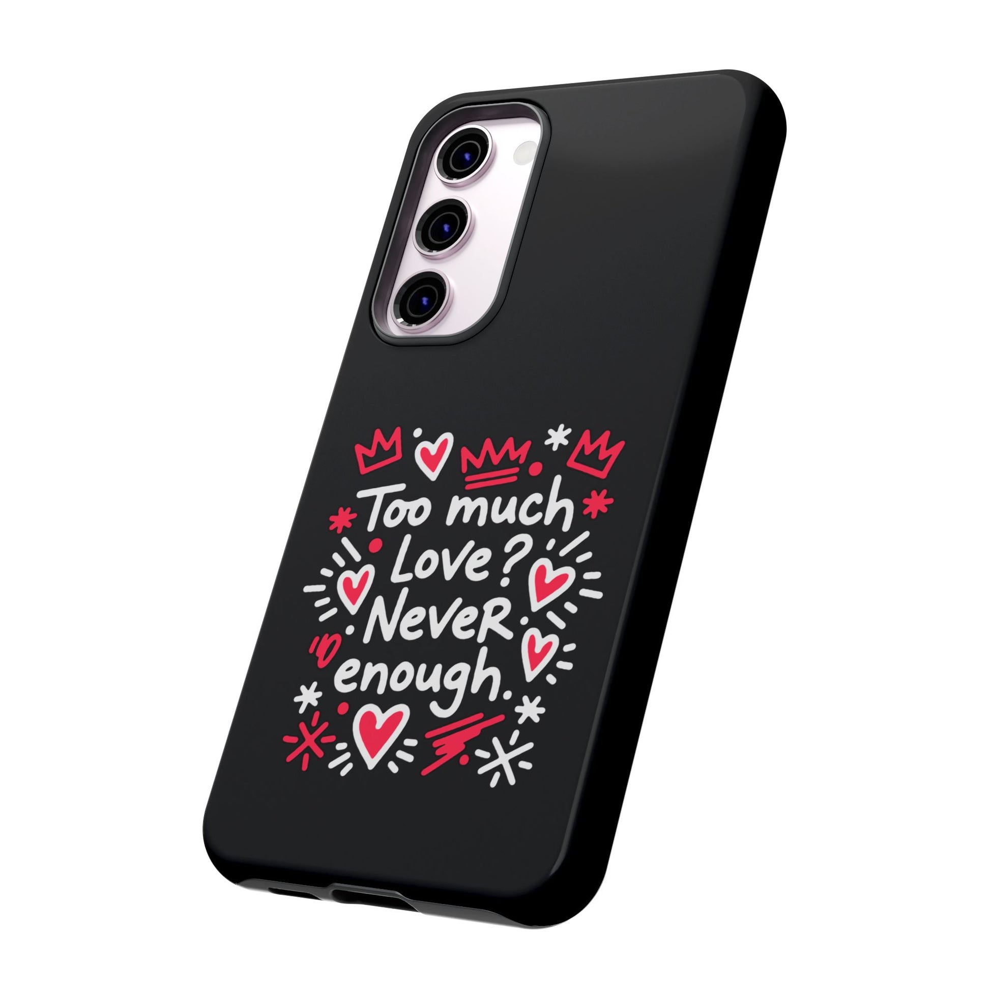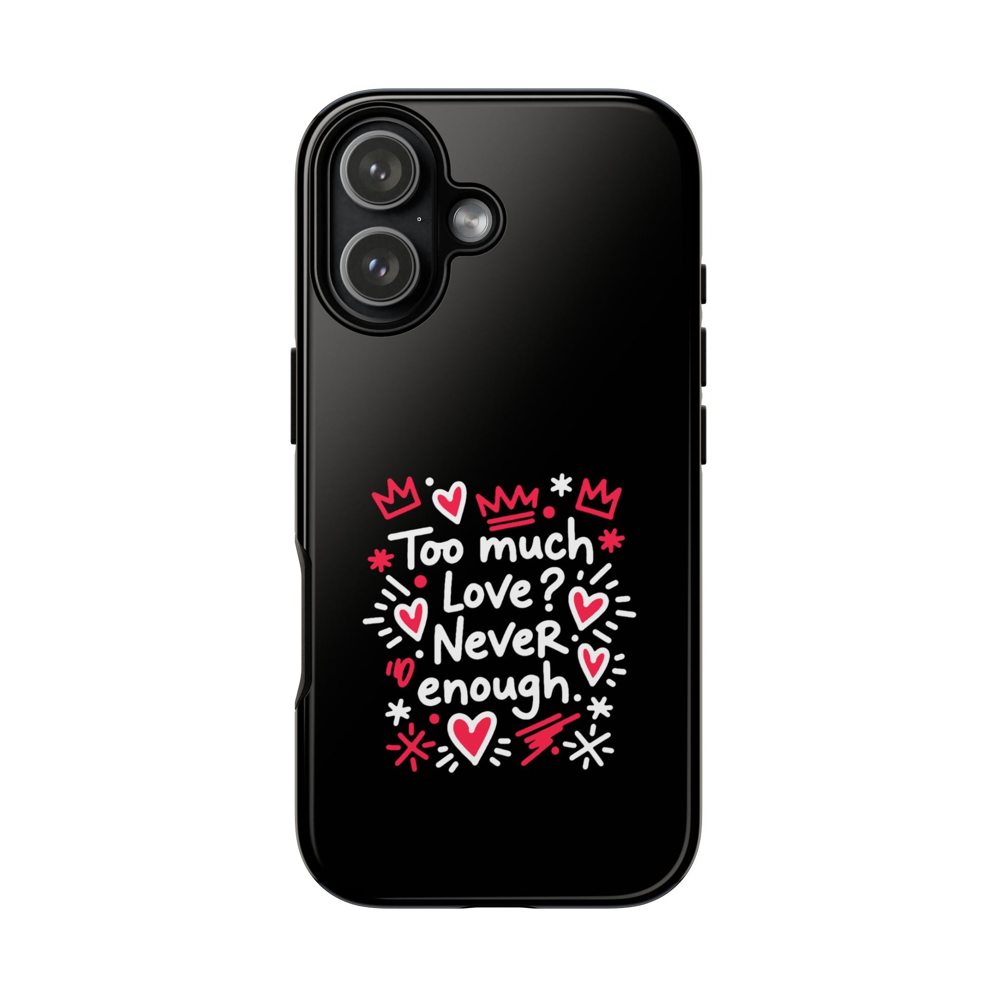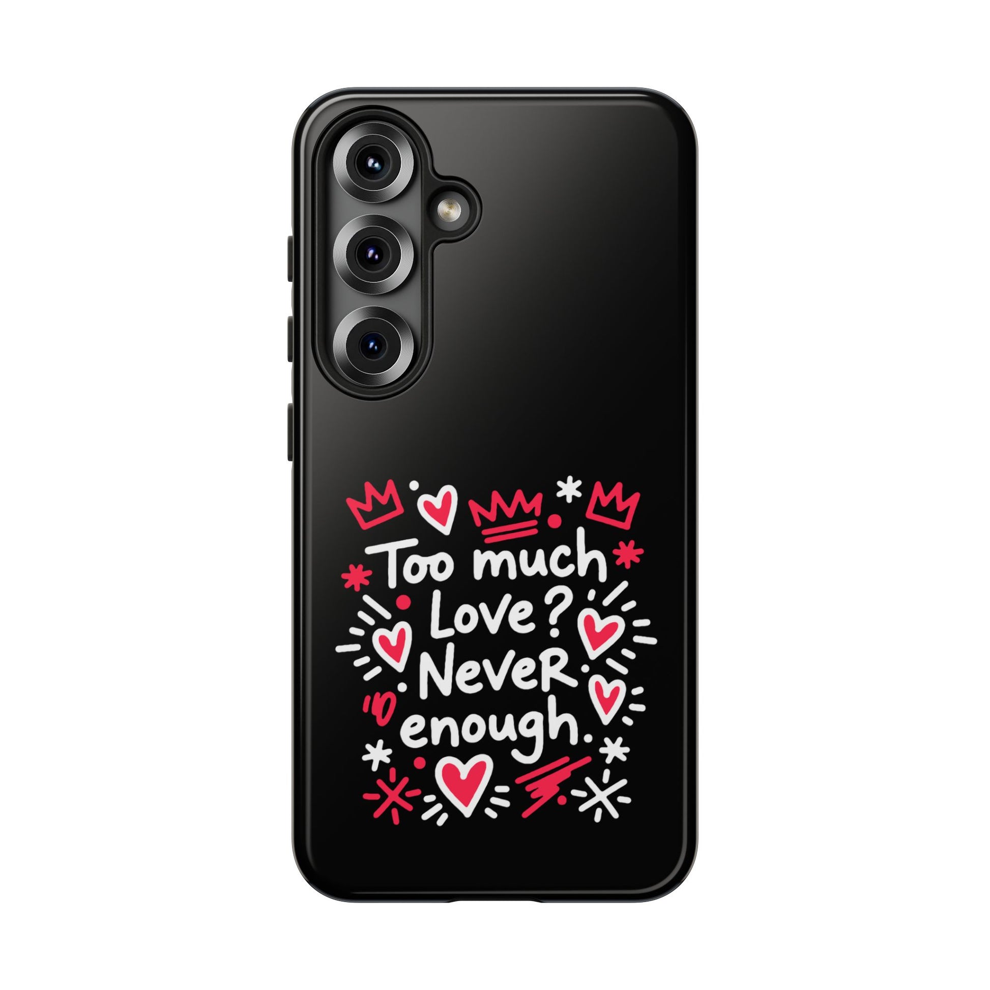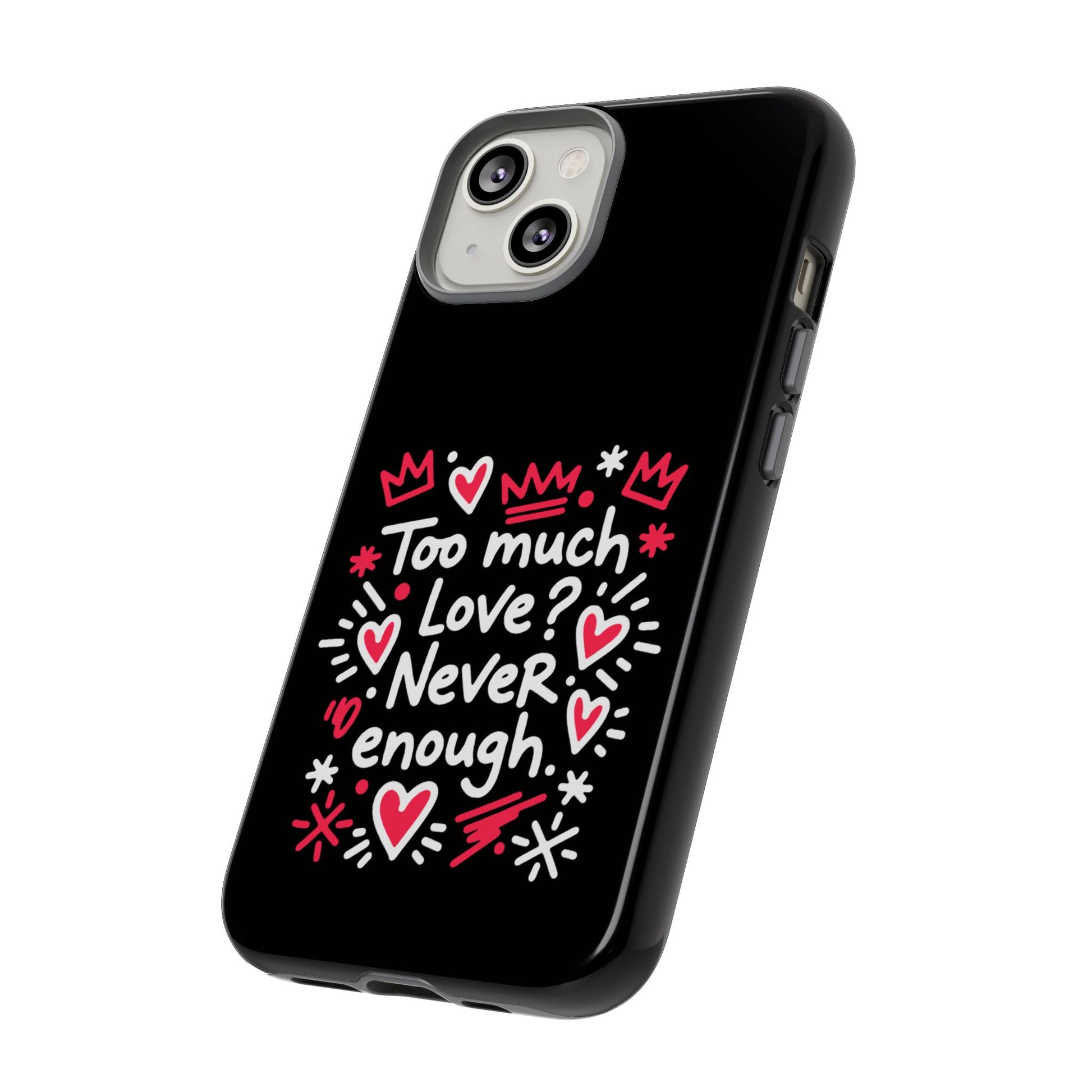 This slim, dual-layer phone case wraps your device in durable protection with a playful, hand-drawn love design. Bold pink hearts, crowns, and energetic doodles surround the handwritten phrase “Too much love?” Never enough,” giving the case an upbeat, personal feel. The glossy or matte finish keeps the artwork vivid, while a TPU silicone liner cushions drops and a polycarbonate shell resists impacts. Lightweight and low-profile, it preserves wireless charging and leaves ports open for easy access. Thoughtful weathering and safety certifications mean this case stands up to everyday life while keeping its charm.