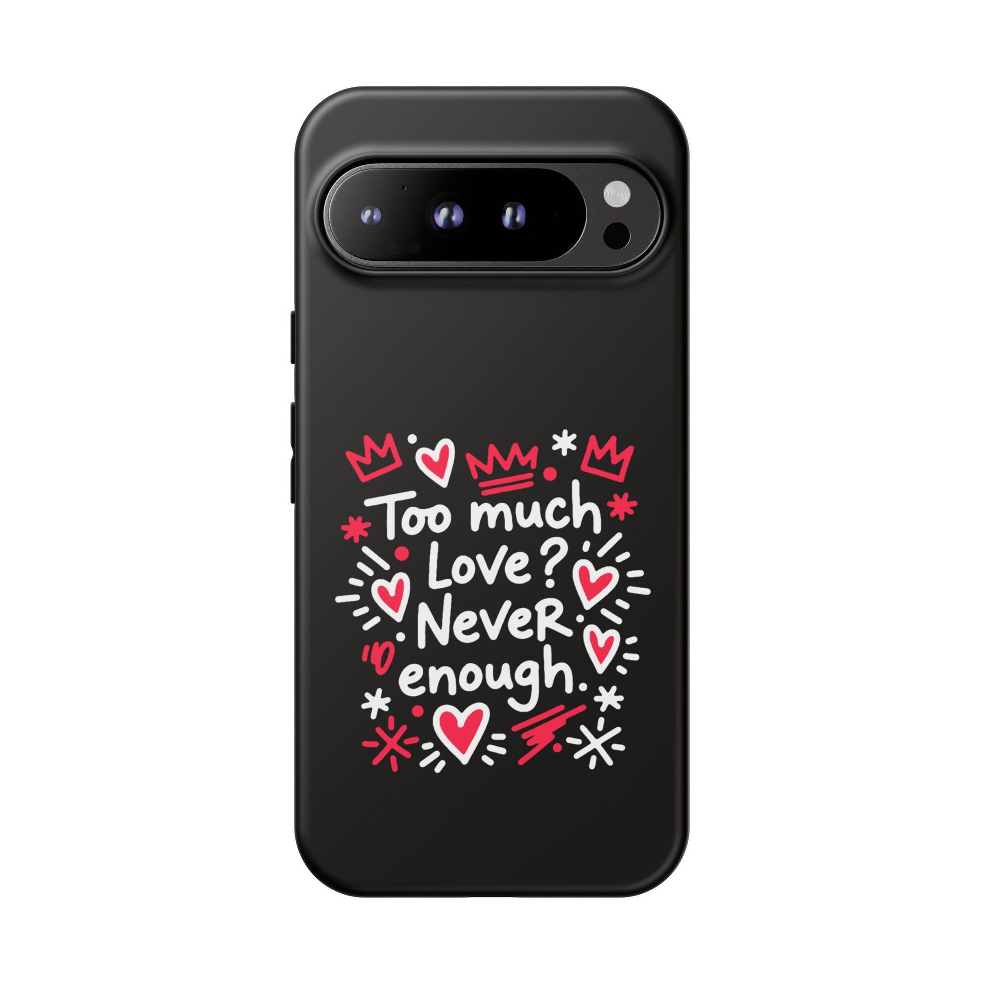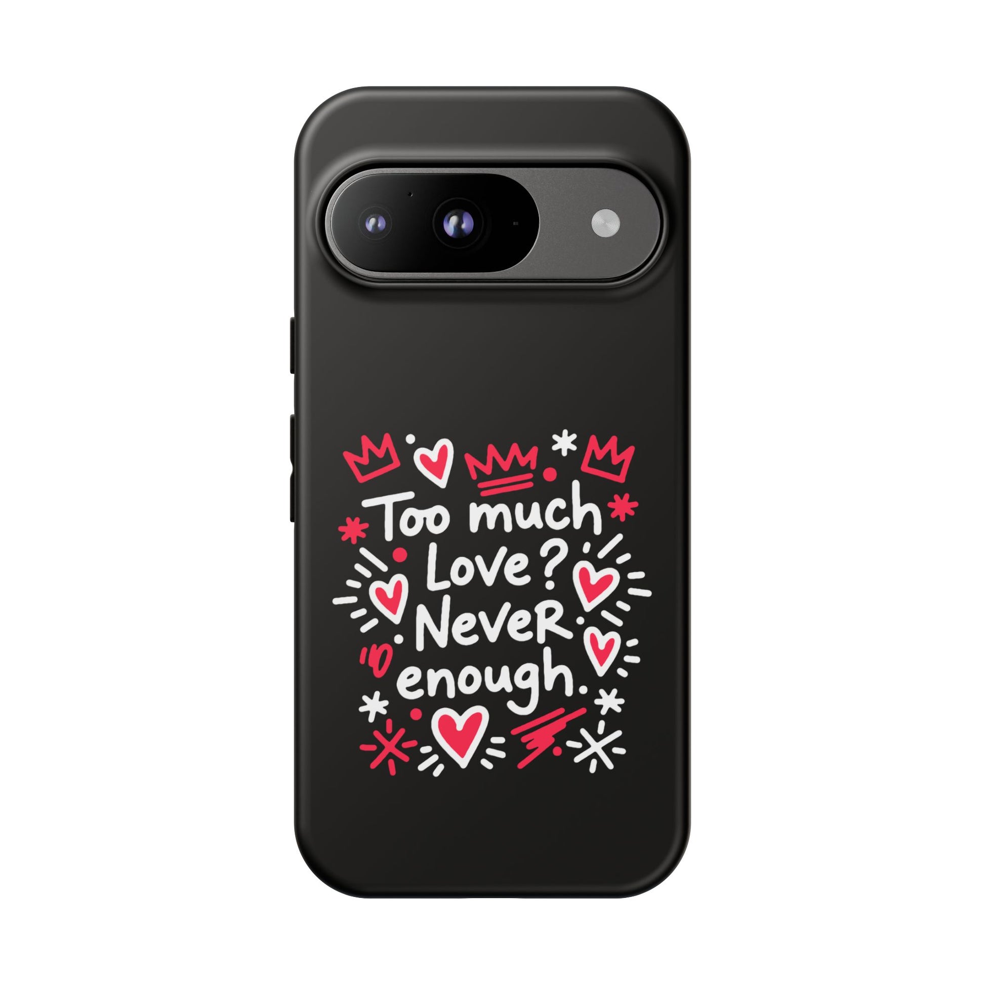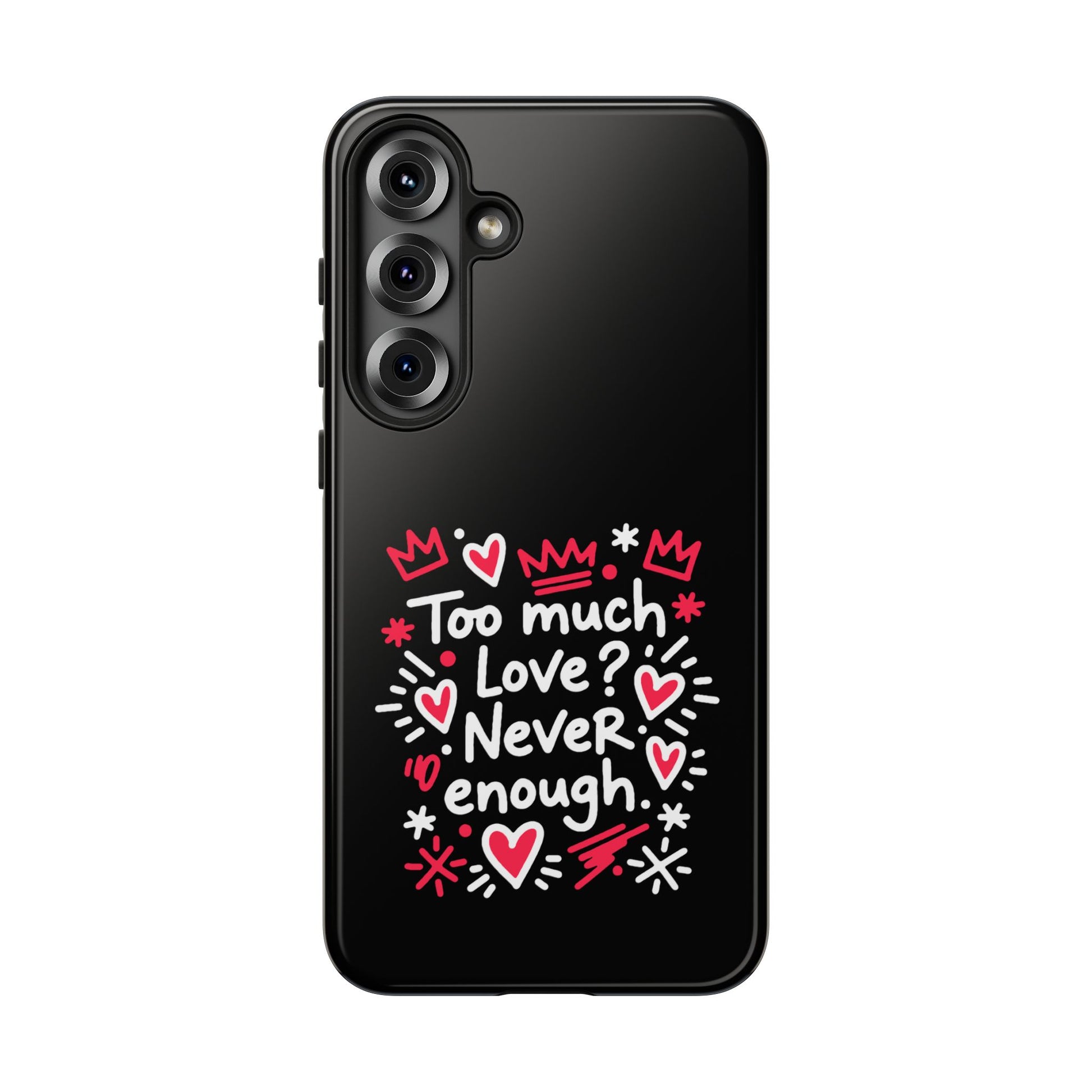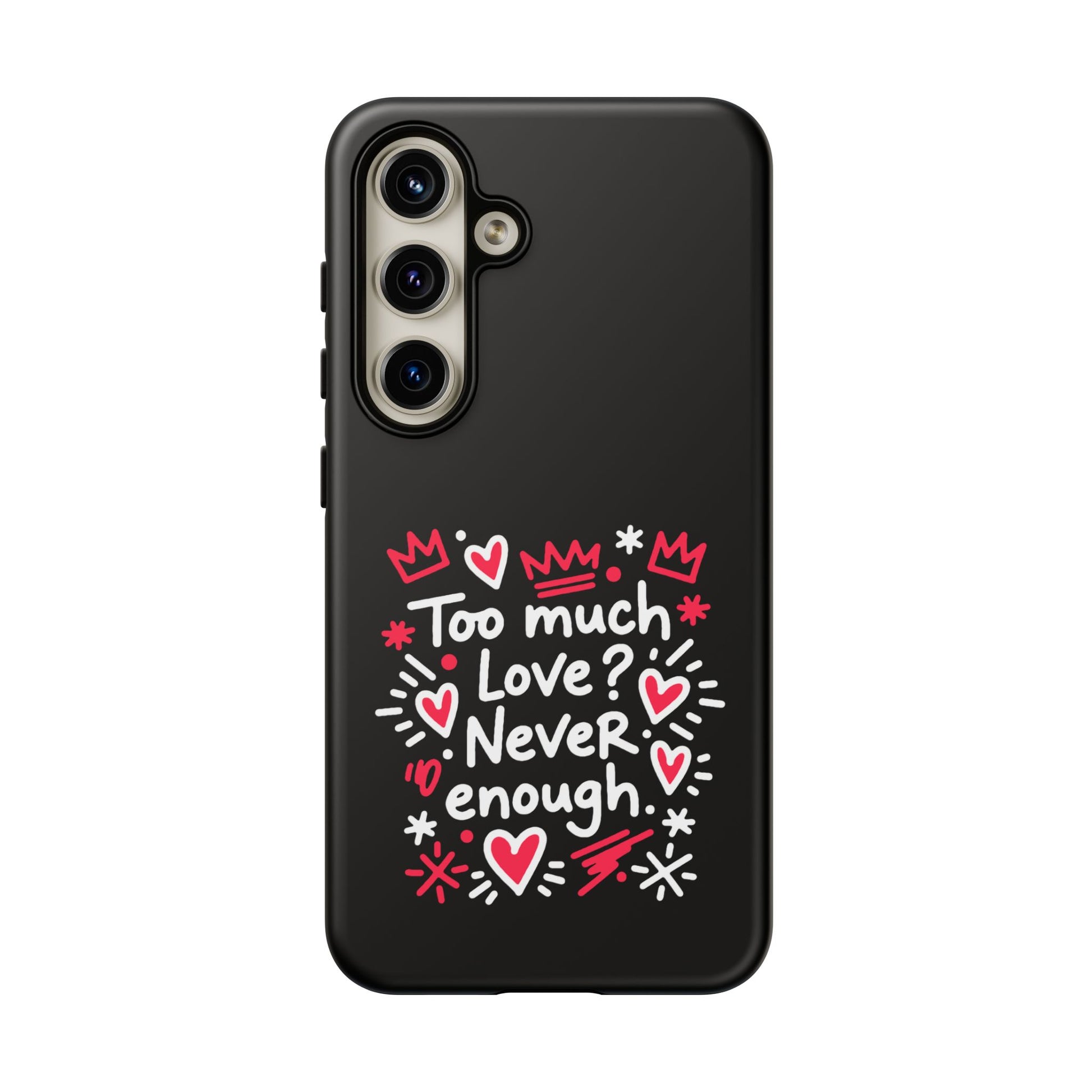 This slim, dual-layer phone case wraps your device in durable protection with a playful, hand-drawn love design. Bold pink hearts, crowns, and energetic doodles surround the handwritten phrase “Too much love?” Never enough,” giving the case an upbeat, personal feel. The glossy or matte finish keeps the artwork vivid, while a TPU silicone liner cushions drops and a polycarbonate shell resists impacts. Lightweight and low-profile, it preserves wireless charging and leaves ports open for easy access. Thoughtful weathering and safety certifications mean this case stands up to everyday life while keeping its charm.