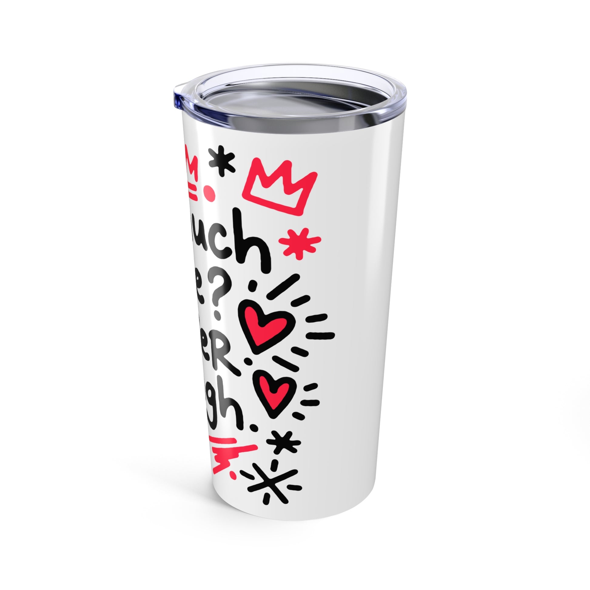 Bright, playful, and built for everyday adventures—this 20 oz stainless steel tumbler carries your drinks and your attitude. Hand-lettered phrases and bold doodles wrap the tumbler in energetic black and coral strokes, punctuated by hearts and crown motifs. The vacuum-insulated body keeps coffee steaming or iced drinks chilled, while the clear push-on lid with a rubber gasket prevents spills during commutes, desk sessions, or quick walks around the neighborhood. Its glossy full-color wraparound finish makes the artwork pop, so the tumbler feels like a personal statement you’ll reach for all day.