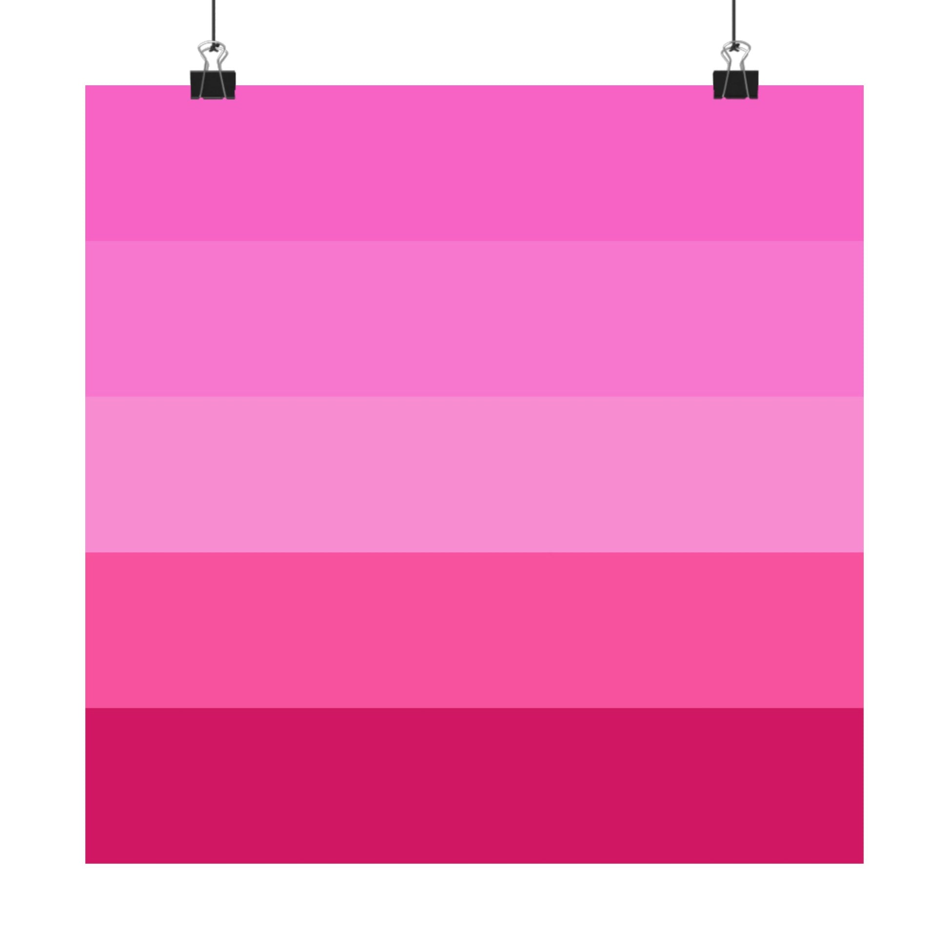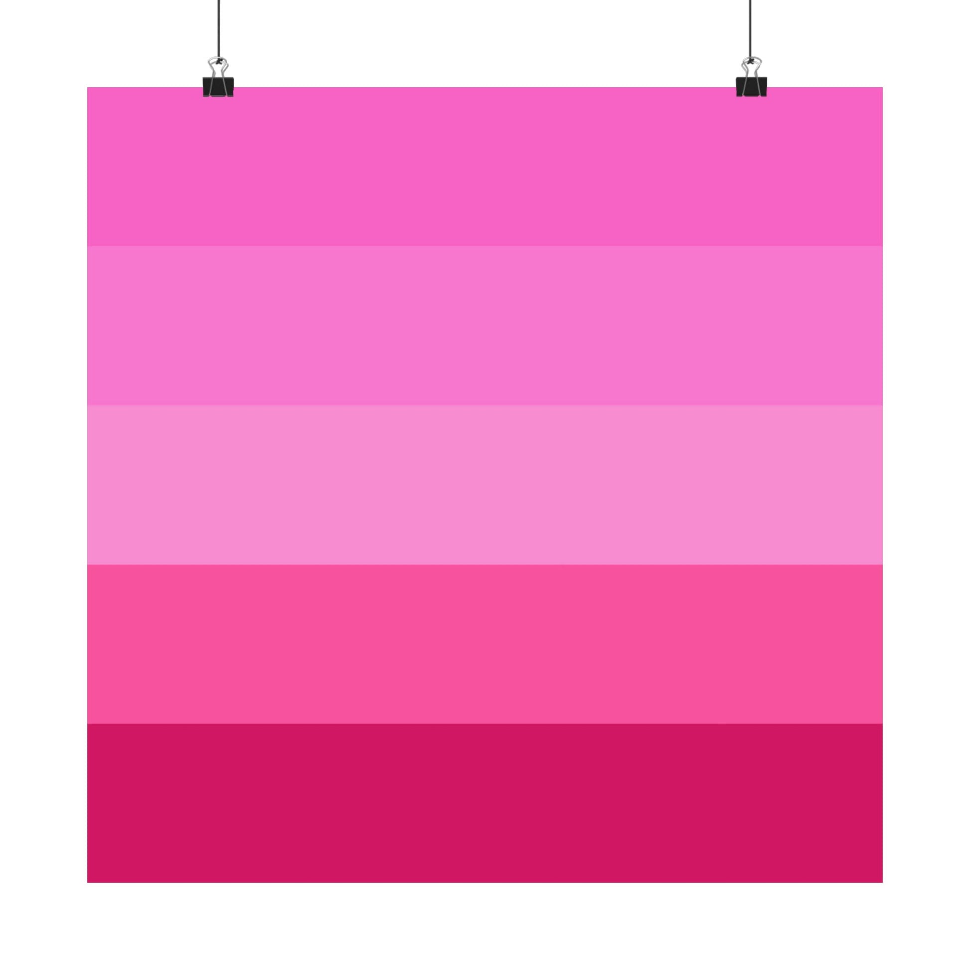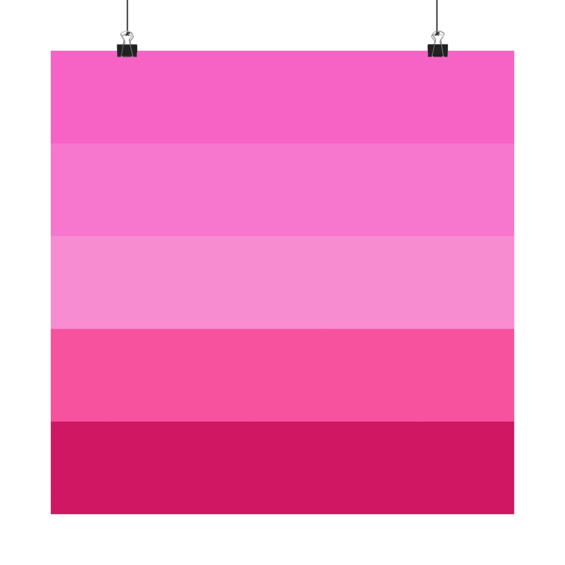 Soft bands of pink melt from bright fuchsia down to deep berry — a quiet gradient poster that brings warmth and personality to a room without shouting. Printed with museum-grade archival paper and giclée inks, this matte poster holds its true hues over time and resists glare so the layered pinks feel velvety on the wall. Hang it in a studio, bedroom, or reading nook to add an intimate, modern accent that complements minimalist, retro, or maximal palettes. The clean horizontal stripes create a calm rhythm that pairs well with plants, warm wood, and brass details, layering color without clutter.