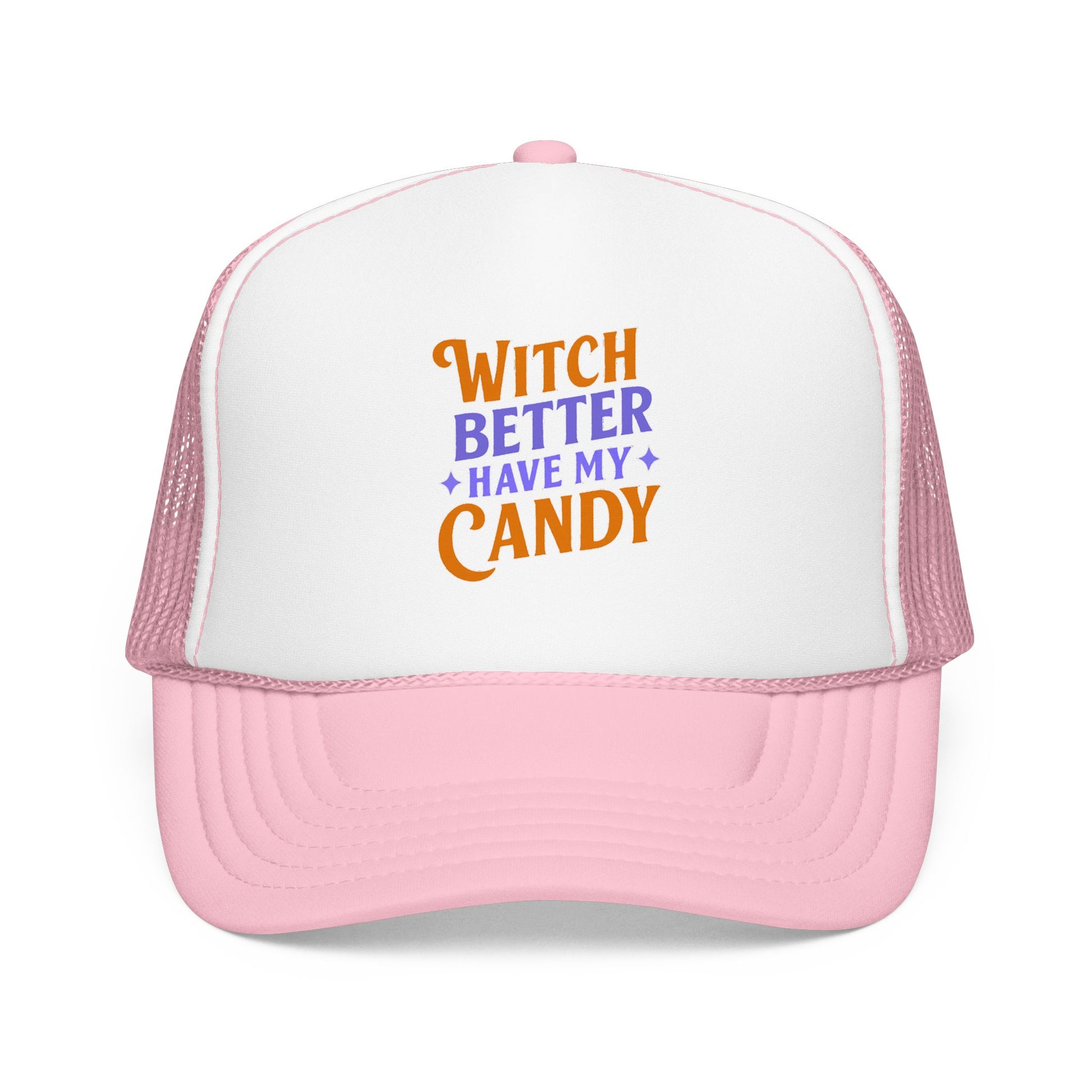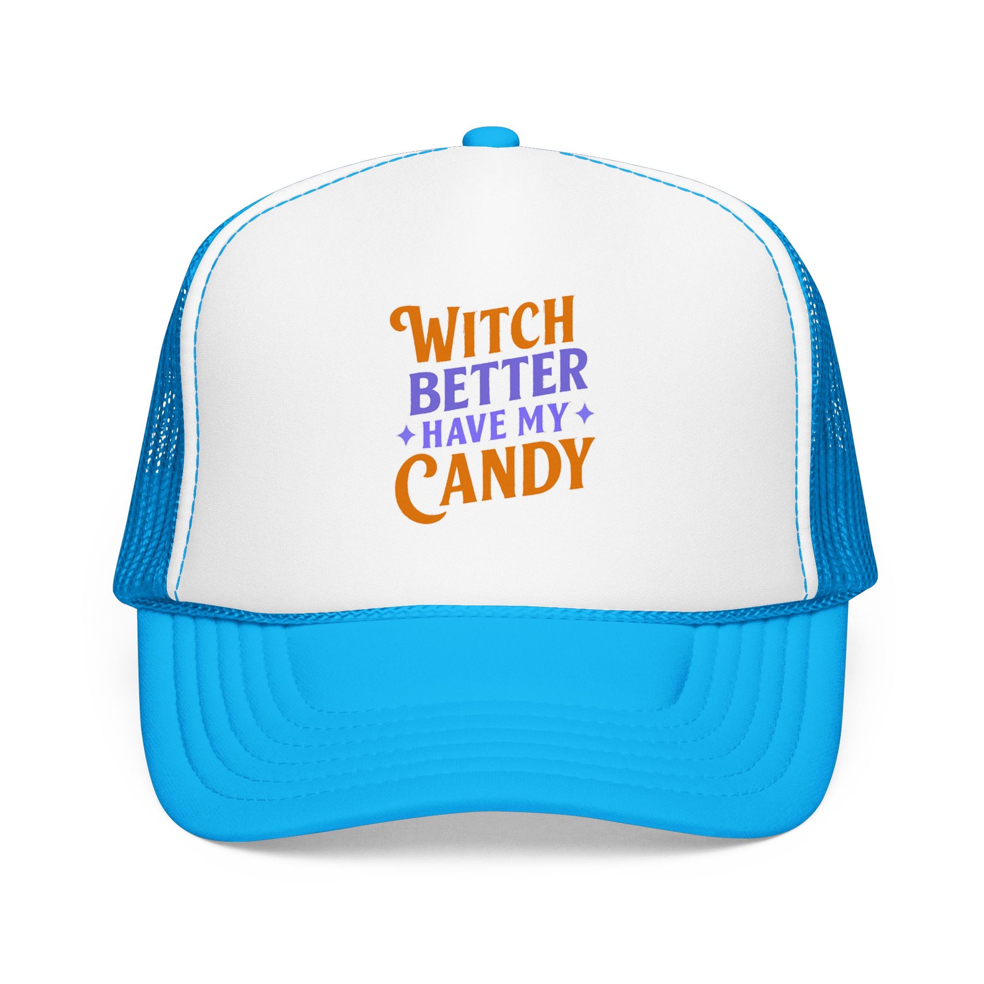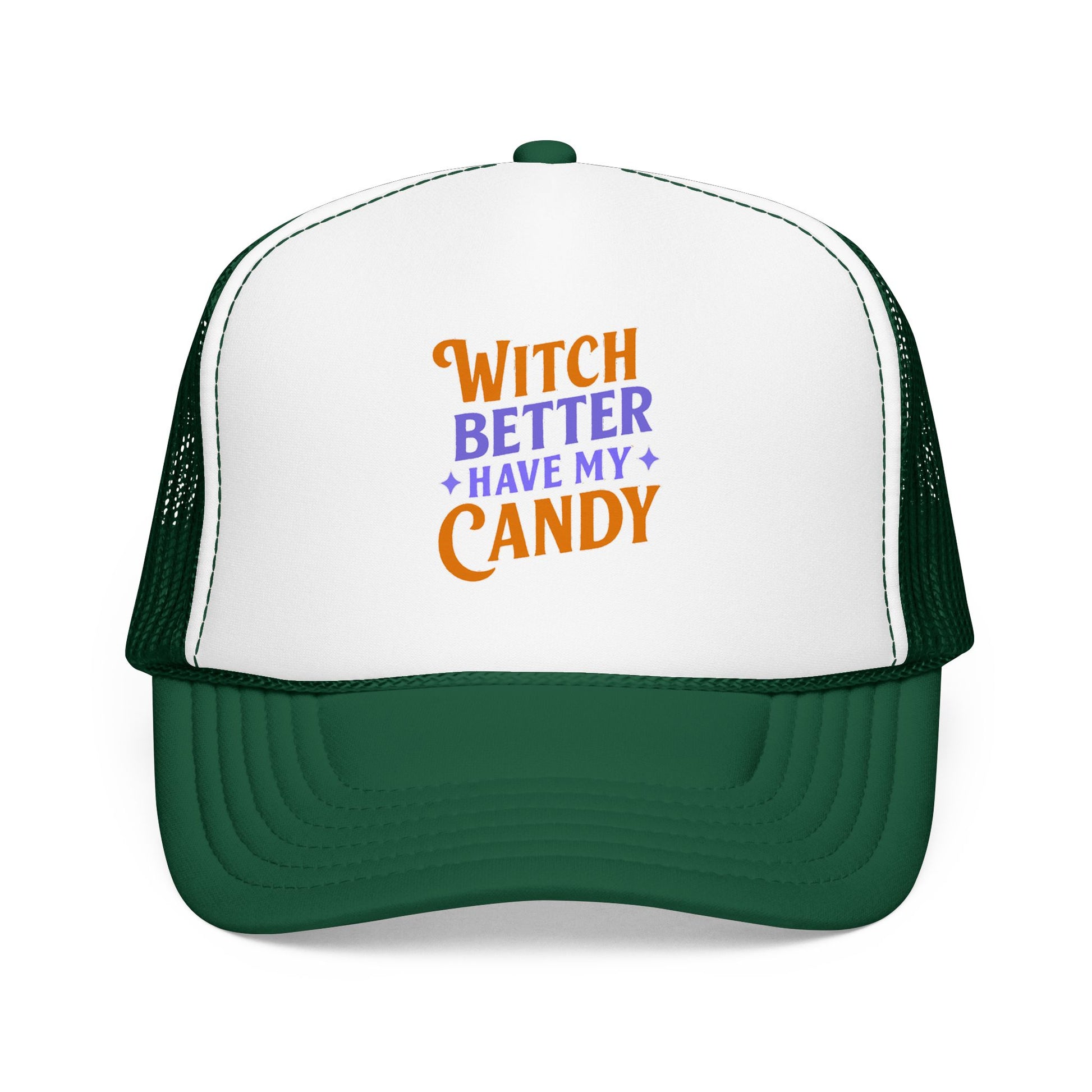 This foam trucker hat brings playful Halloween energy to everyday wear. The seamless foam front features bold, embroidered lettering that reads “Witch Better Have My Candy” in candy‑colored orange and lavender, framed by tiny star accents. The high‑profile, structured crown and pre‑curved visor give it a classic trucker silhouette, while the breathable mesh back keeps things cool during autumn nights. Wear it on pumpkin‑patch runs, trick‑or‑treat rounds, or casual fall meetups to add a cheeky, spell‑friendly vibe to a layered jacket or cozy flannel. It sits confidently above the brow and stays comfortable all evening thanks to the adjustable snapback and soft inner sweatband. For anyone who loves a mix of vintage trucker style and seasonal sass, this hat reads like a grown‑up treat—fun, a little witchy, and ready for October mischief.