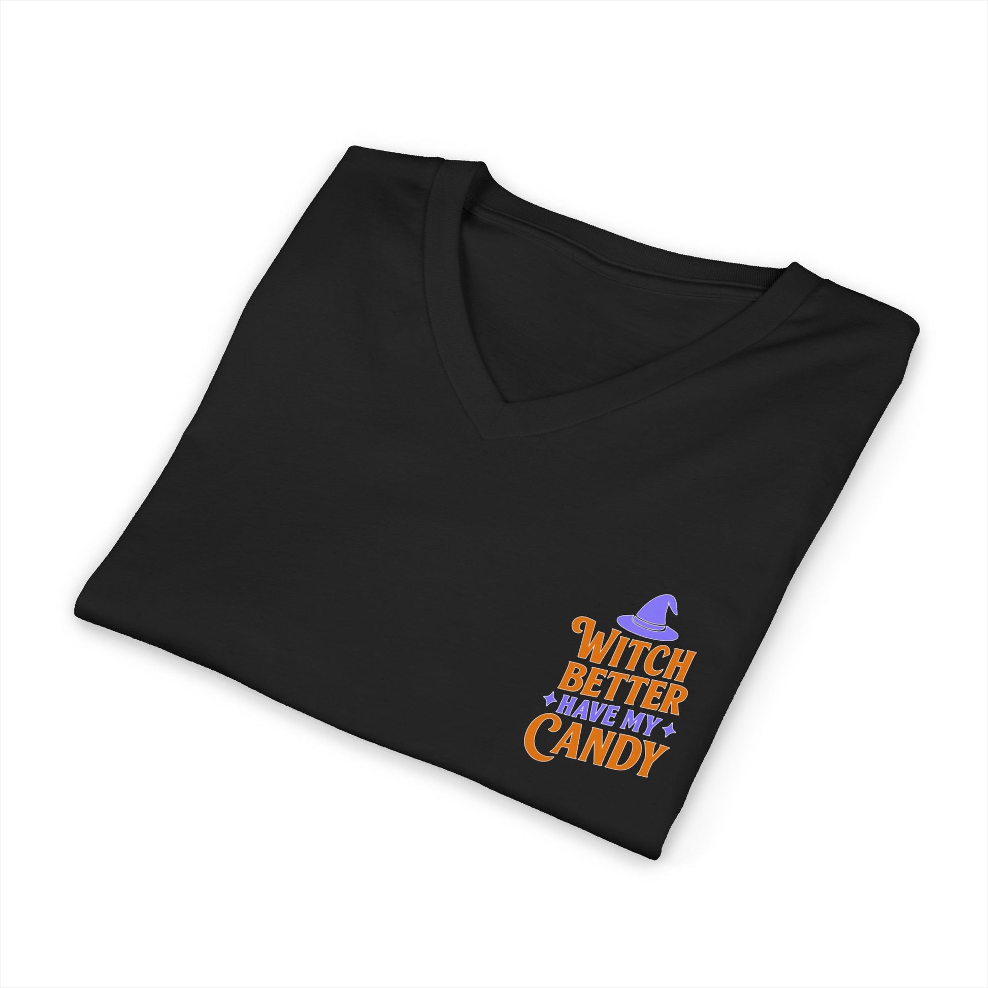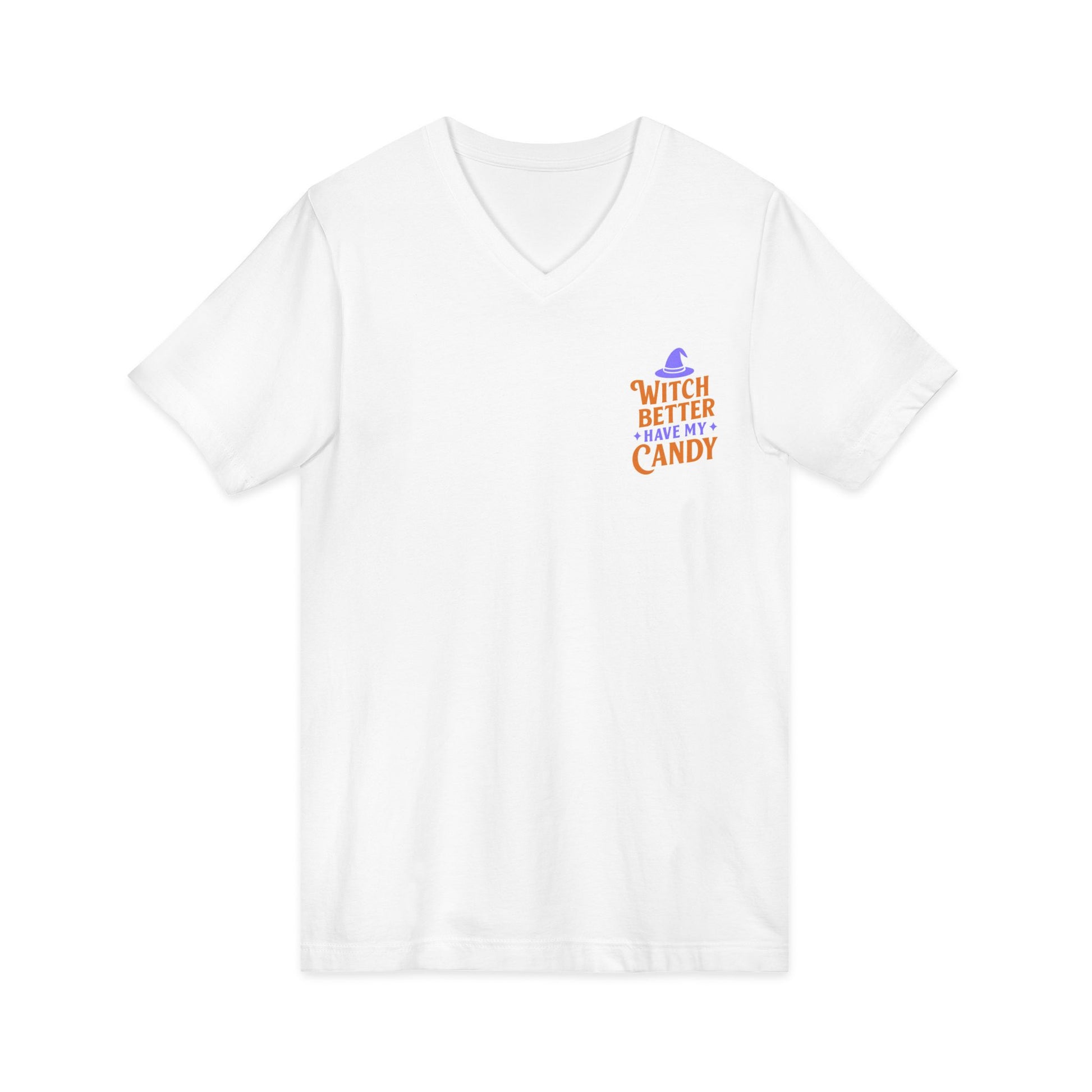 Introducing this stylish Unisex Jersey Short Sleeve V-Neck Tee, perfect for adding a touch of fun to your wardrobe! With its eye-catching 'Witch Better Have My Candy' design, this tee embodies a playful Halloween spirit while remaining versatile enough for everyday wear. Crafted from lightweight, breathable fabric, it promises a comfortable fit, making it a go-to choice for casual outings or festive events. Ideal for adults, this tee is perfect for Halloween gatherings, themed parties, or simply enjoying a cozy evening at home. Whether dressing up or keeping it casual, this tee will elevate your look while bringing a smile to your face!