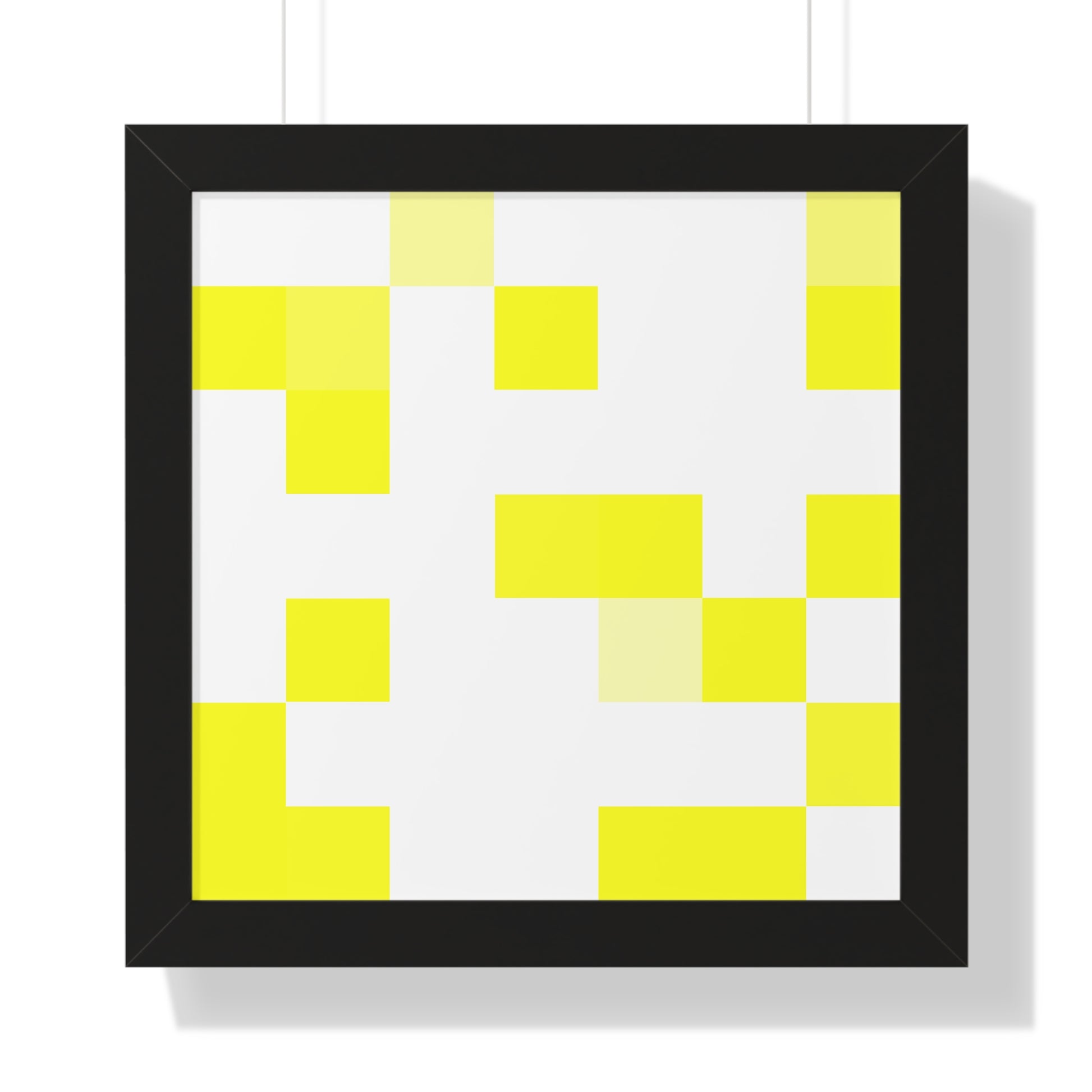 A bright, modern framed vertical poster that brings clean geometry and a pop of yellow into a room. Printed on museum-quality matte paper, the design features crisp blocks of sunshine-yellow arranged with airy negative space, giving a minimalist yet playful energy. The print is set behind a protective acrylic cover and finished in your choice of black, white, or warm walnut frame—MDF or lightweight Ayous wood—so it hangs flat and looks gallery-ready. It arrives with hanging hardware included or built in, and is made with archival materials that resist yellowing so the vivid tones stay true for years. This piece fits naturally above a console, beside a reading nook, or in a compact living area that needs a dose of modern warmth.