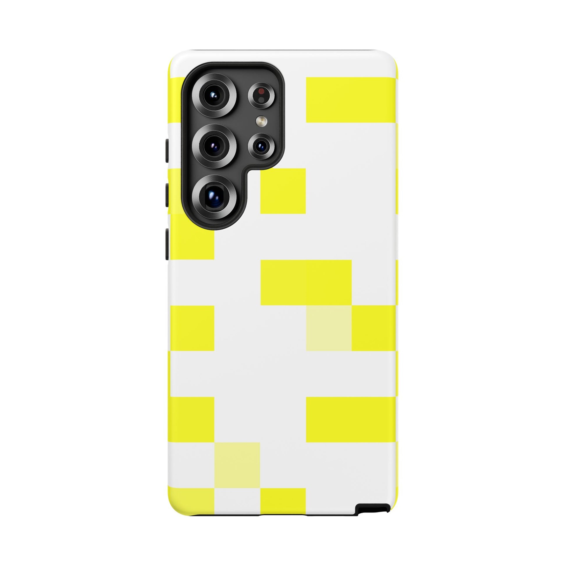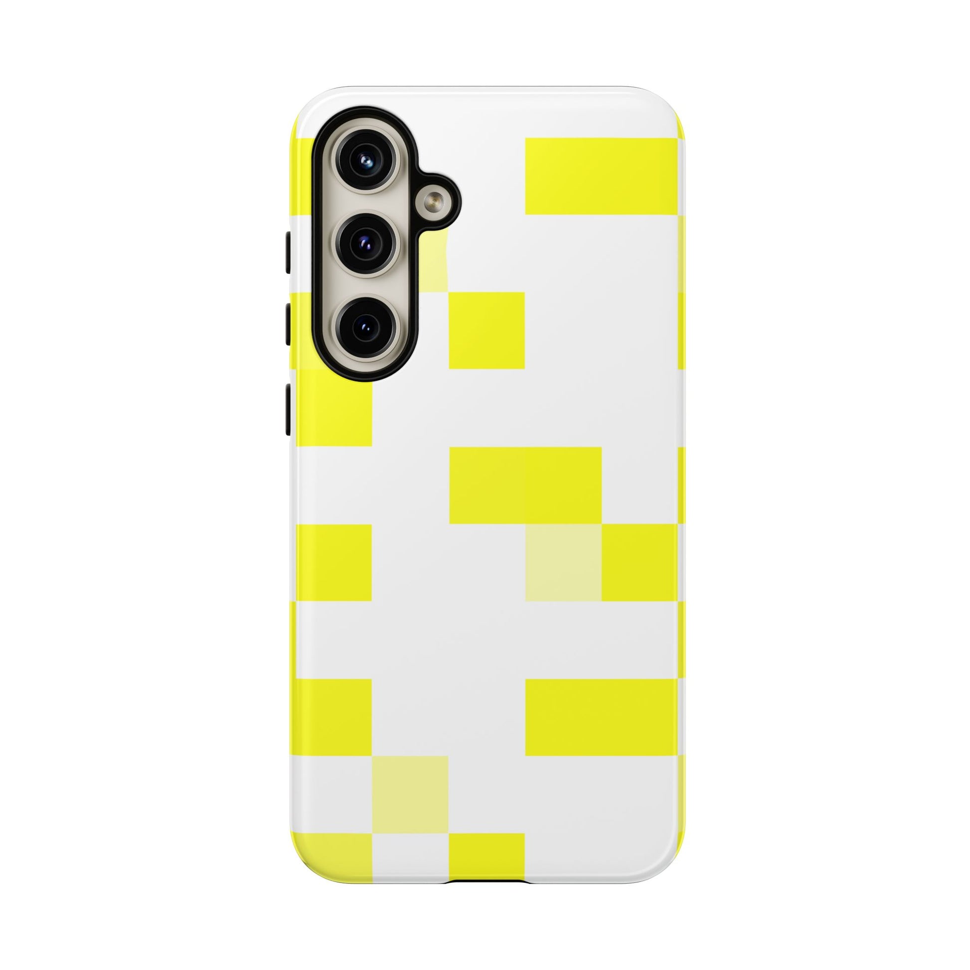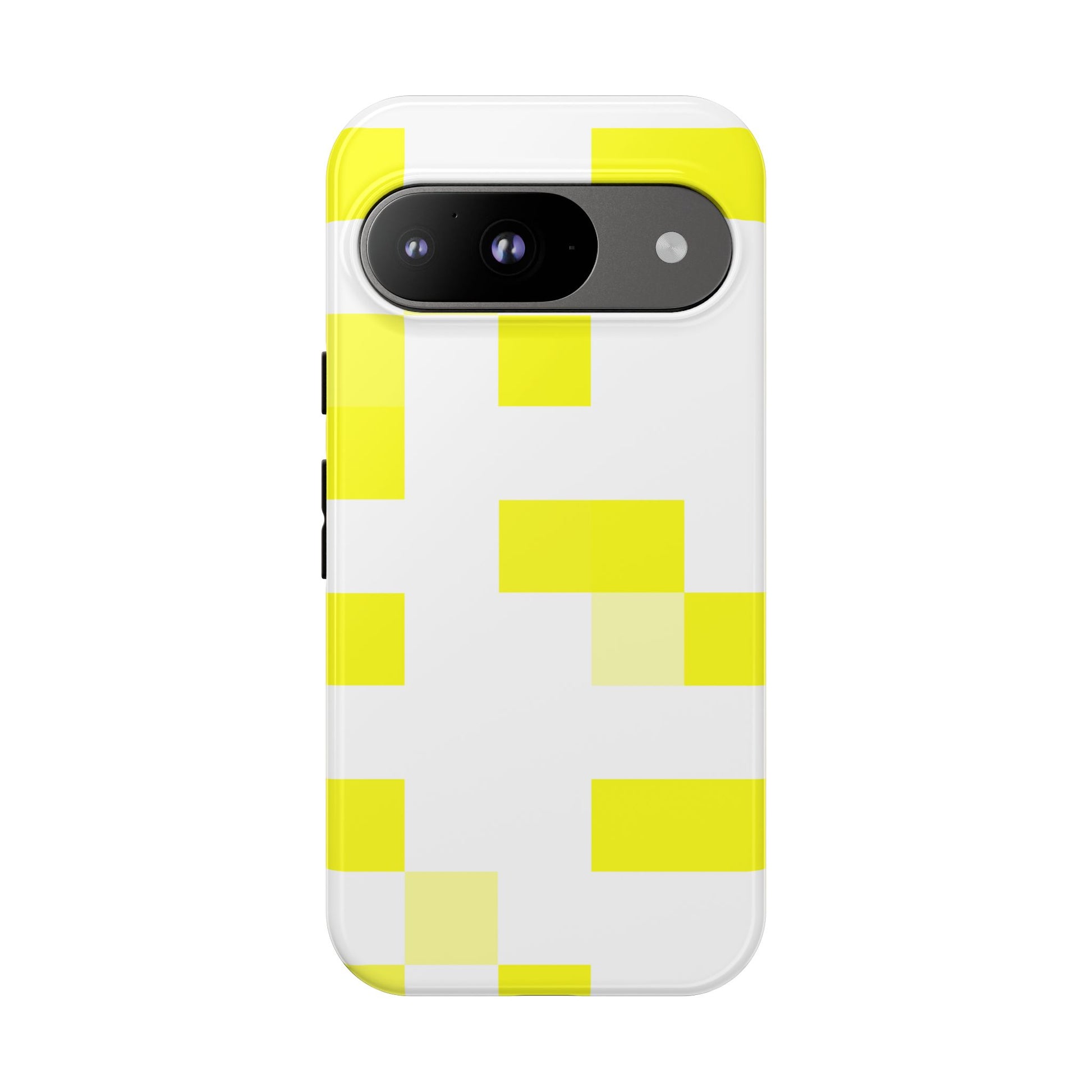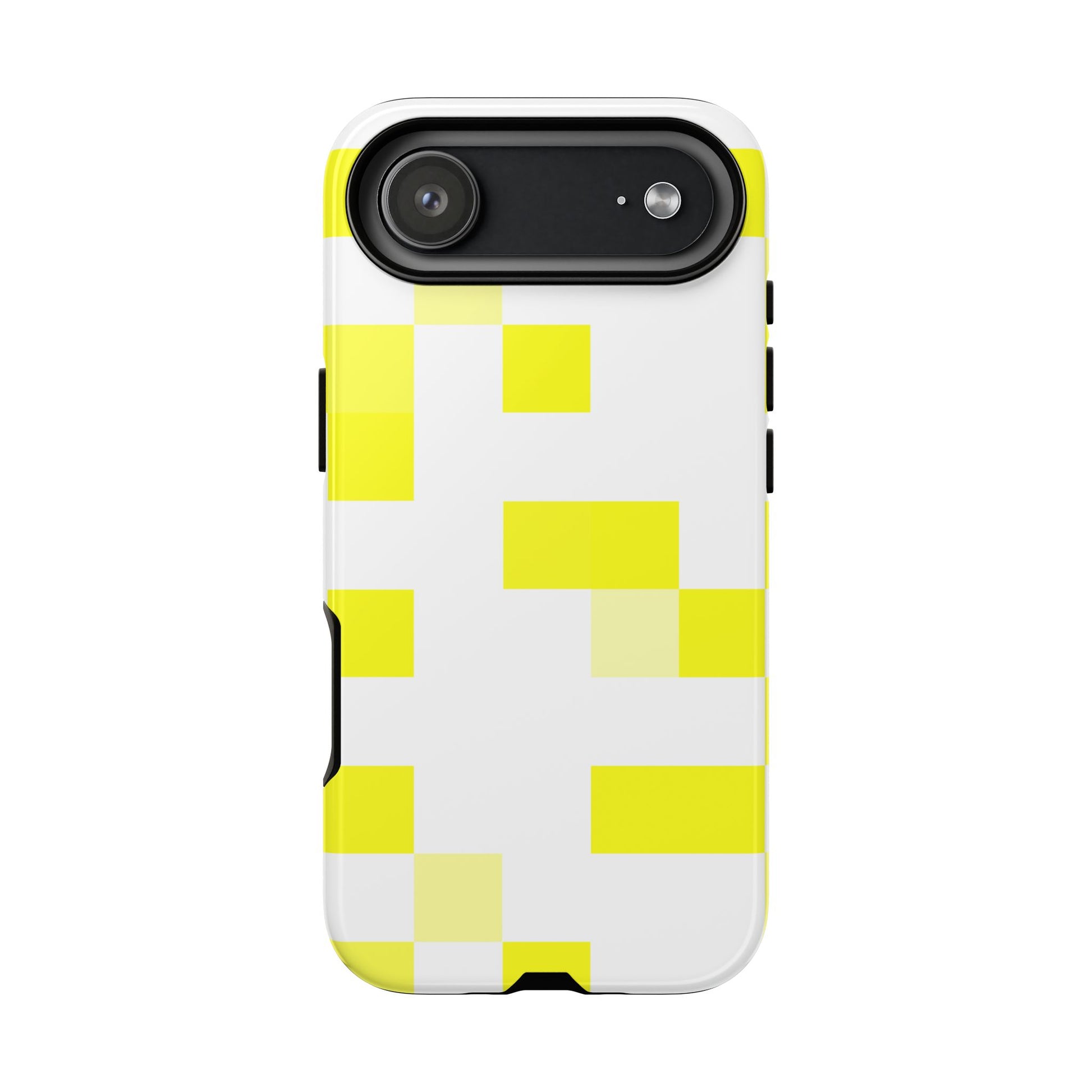 This protective phone case brings a bright, modern energy to your daily carry. The clean white shell is patterned with bold yellow blocks that catch the eye without shouting — a minimalist, playful look that pairs well with casual and creative wardrobes. Built as a dual-layer shield (polycarbonate shell + TPU silicone liner), it absorbs shocks while keeping a slim profile. The glossy or matte finish keeps the color pop crisp, and UV protection preserves the design when you use your phone outdoors. Thoughtful details like clear port openings and wireless-charging compatibility mean the case feels like a natural extension of your phone, not a compromise. Keep it away from high-alcohol liquids and heavy sunscreens to maintain the print’s longevity.